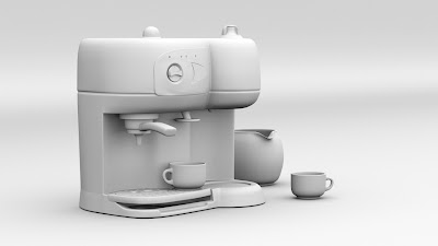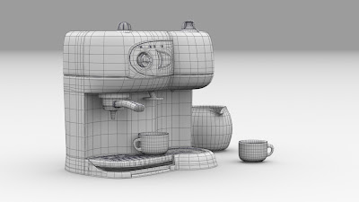 Modeling, filaire, puis mise en lumière, shaders et textures d'un combiné café-expresso (travail en cours).